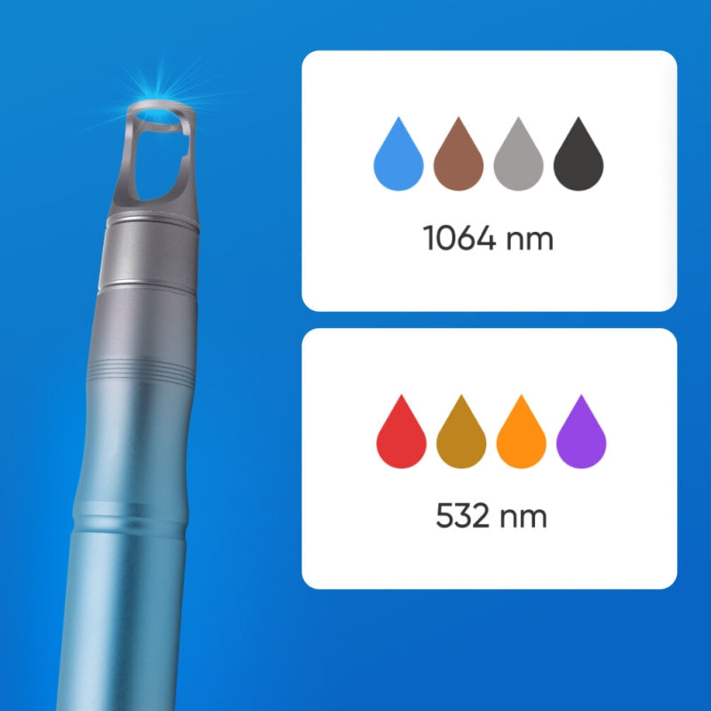 - 1064 nm: Tämä aallonpituus on tehokas syvempien mustevärien, kuten mustien ja sinisten, sekä dermisten pigmentaatio-ongelmien käsittelyyn.